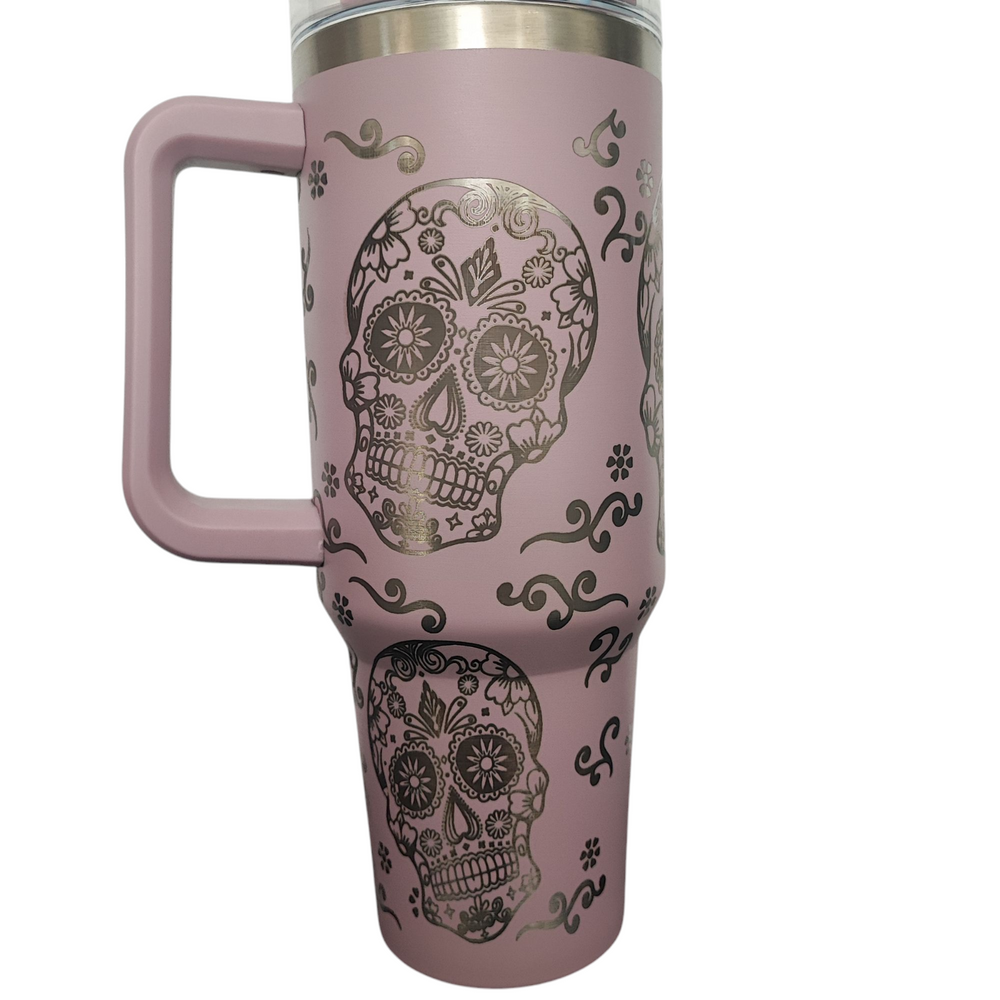 Embrace bold and artistic vibes with this stunning **Sugar Skull Engraved 40oz Stanley-style Tumbler**. Perfect for coffee, tea, or cold beverages, this tumbler keeps your drinks at the perfect temperature while adding a touch of edgy elegance to your style.
