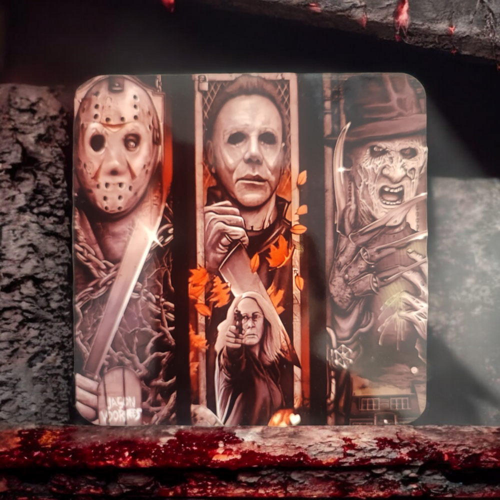 Elevate your horror decor with these stylish and eerie coasters, perfect for creating a chilling ambiance in any setting. Order now and let these iconic horror villains haunt your home!