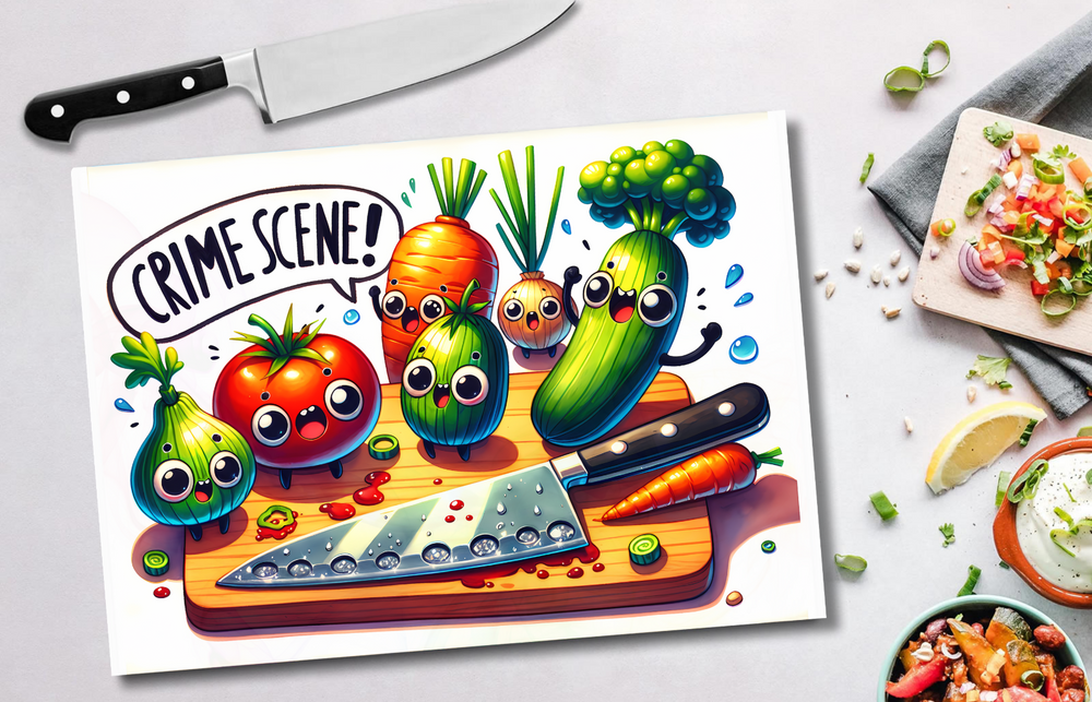 Add some laughter to your kitchen with this tempered glass chopping board featuring a cheeky “Kitchen Crime Scene” cartoon. Whether you’re slicing onions or serving cheese, this board does it with style and sass!