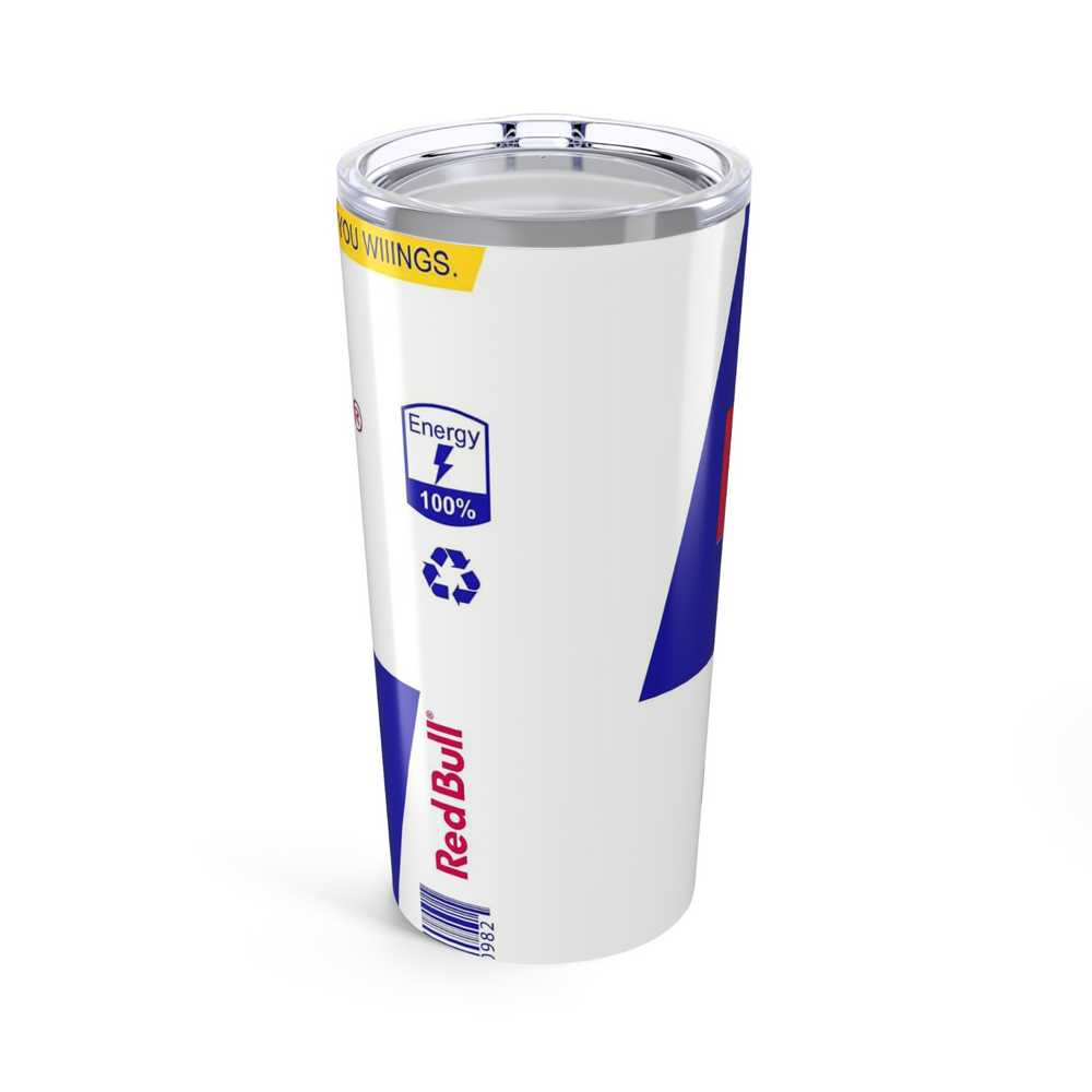 Enjoy your favorite hot or cold drinks on-the-go with this 20oz stainless steel tumbler inspired by Red Bull. The push cap top, straw, and straw cleaning brush included in the set make it easy to use and maintain. This tumbler is a must-have for fans of the popular energy drink, and it's perfect for use while exercising or on-the-go. Constructed from high-quality materials, this tumbler is built to last. It's 8 inches tall and 9 inches wide, with a weight of 20oz, making it easy to carry in a bag or backpack. Whether you're heading to the gym or simply running errands, this tumbler is the perfect choice for keeping your drinks at the right temperature. Order yours today and start enjoying your drinks in style!