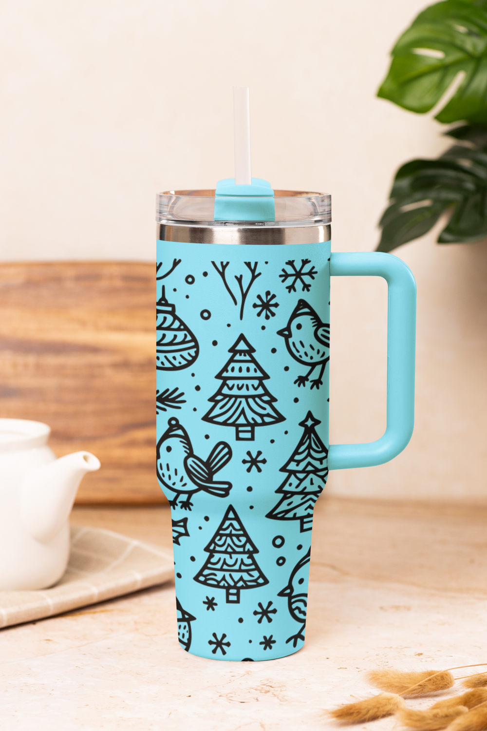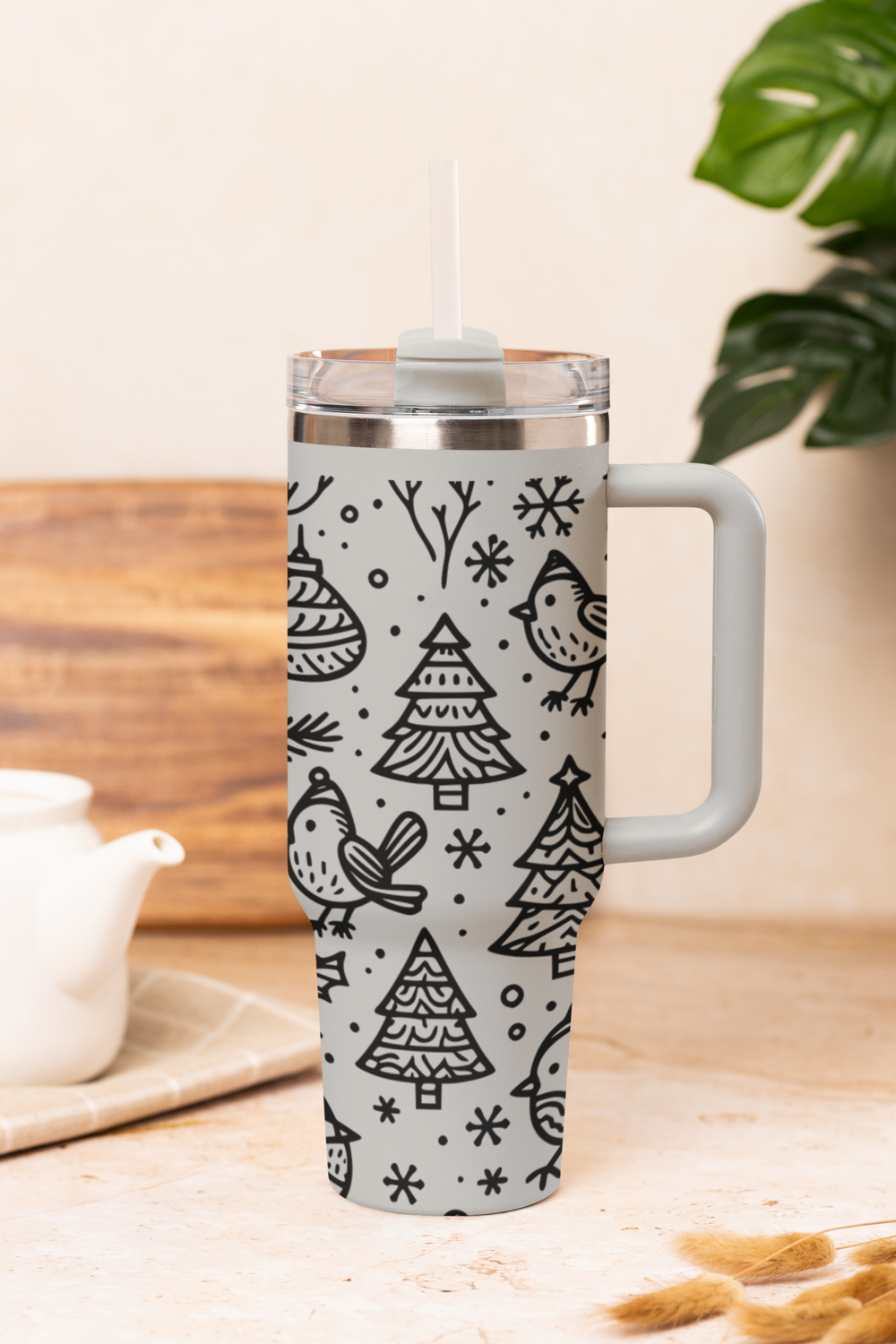 Add a touch of festive charm to your drinkware collection with this 40oz stainless steel tumbler featuring a delightful robin and Christmas tree design. Styled like the iconic Stanley tumbler, it's perfect for staying hydrated during the holiday season—whether you're sipping hot cocoa by the fire or enjoying iced drinks on the go.