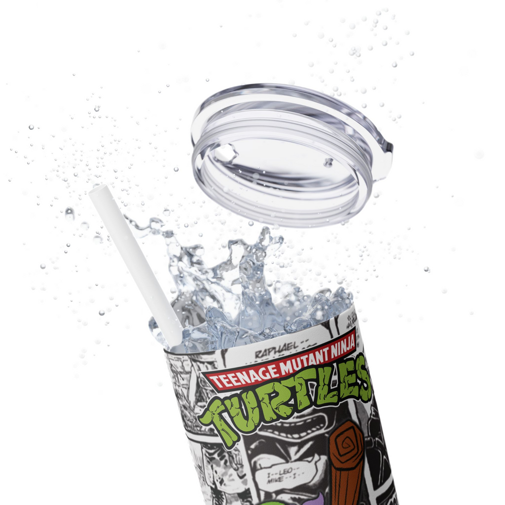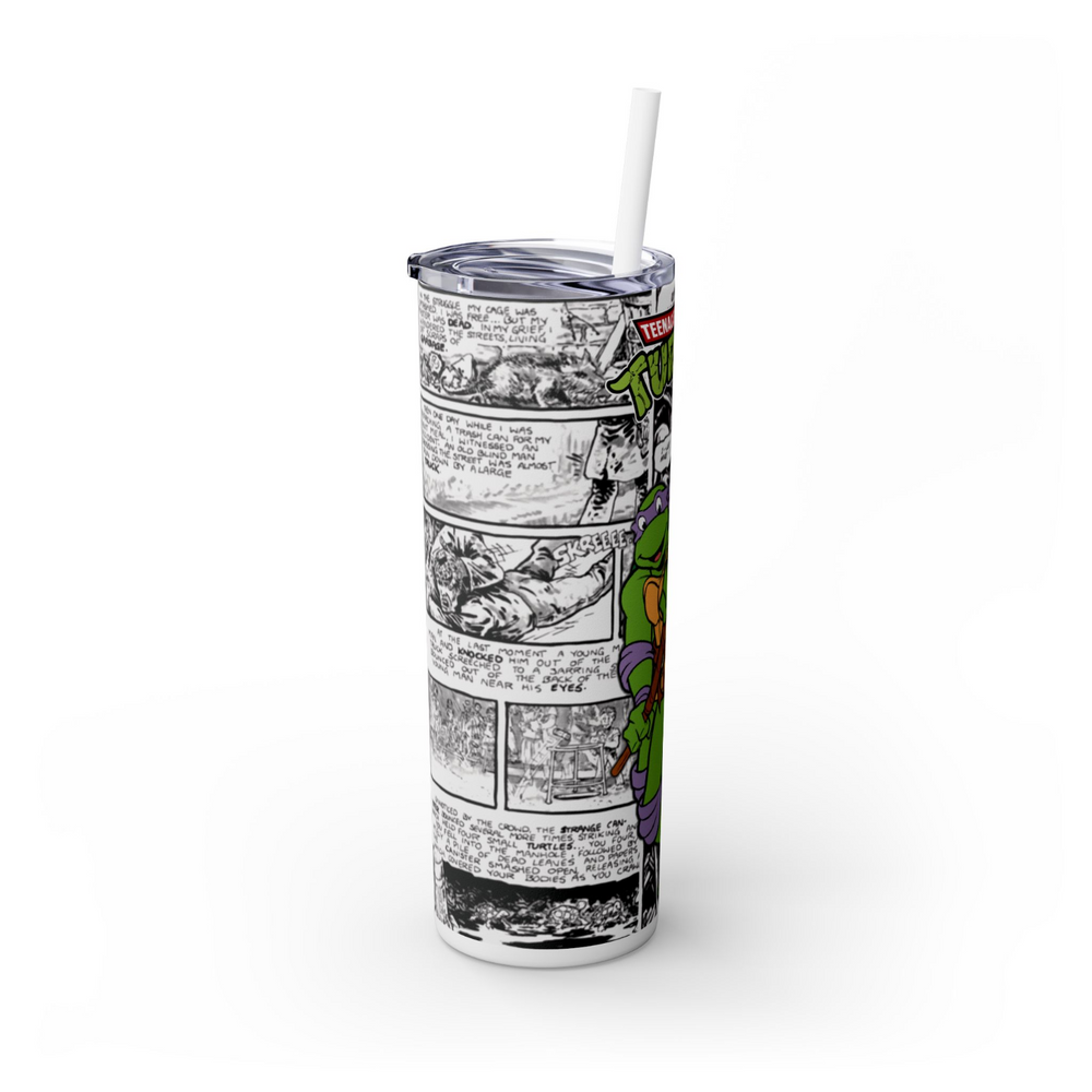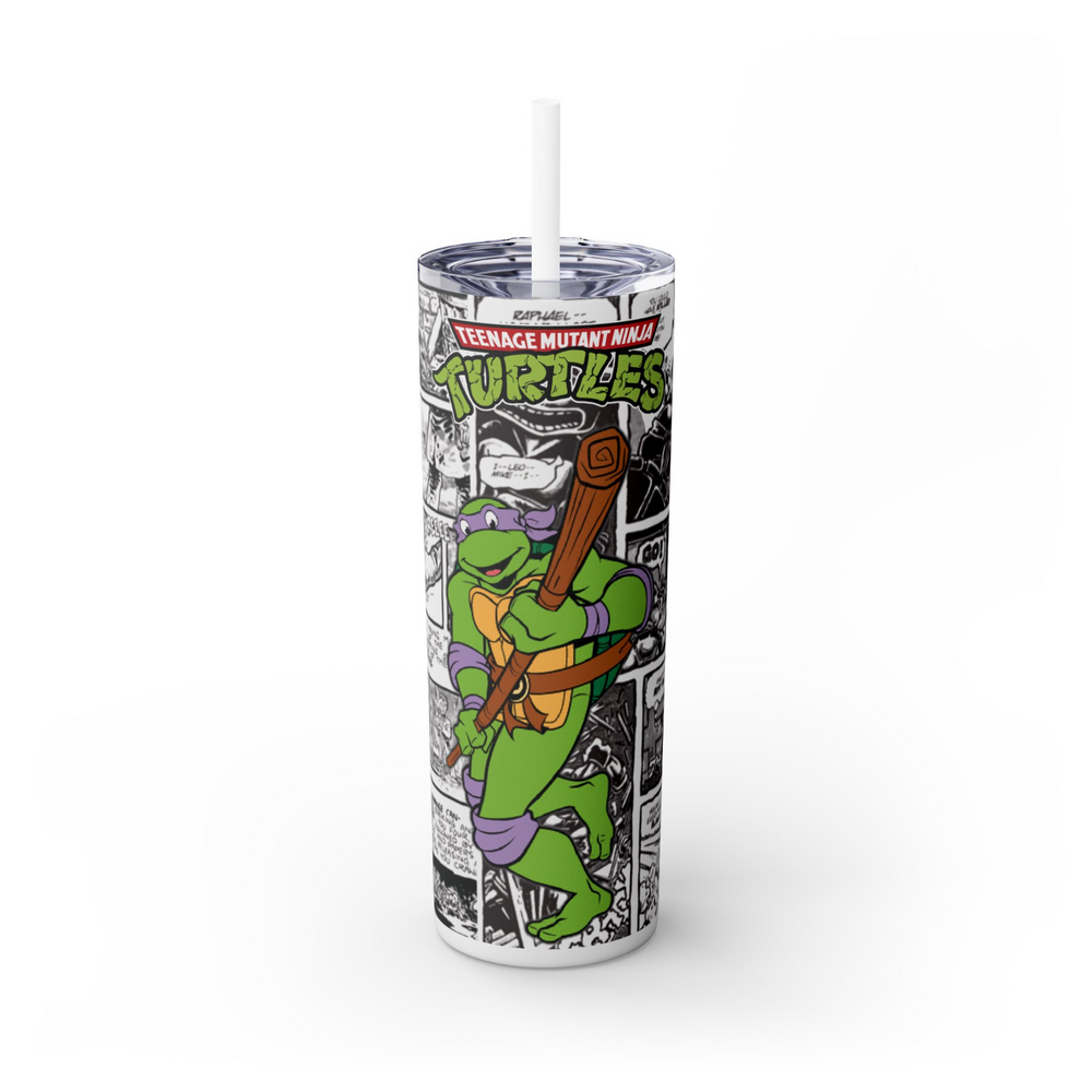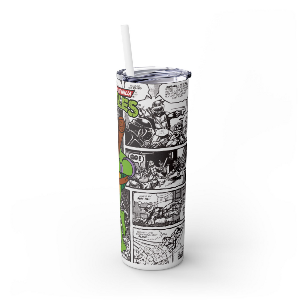 Step into classic comic nostalgia with this Teenage Mutant Ninja Turtles-themed skinny tumbler! Featuring Donatello in vibrant colours over a detailed black-and-white comic book background, this design pays homage to the original TMNT series.